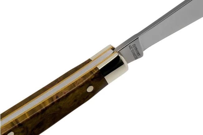 This Böker Delicate Curly Birch 117016 is a classic slipjoint pocket knife. A beautiful slim gentleman’s knife, of which only a limited amount were produced. Perfect to cut a steak or to peel an apple. In between the nickel silver bolster you will find a curly birch wood inlay. It is a type of wood enhanced with a stunning pattern. This knife is stabilized with green resin to make sure it is almost as strong as plastic.