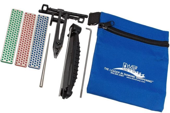 The DMT Aligner Easy Edge sharpening system contains all parts you need to quickly sharpen your knife. The heart of the set is comprised of three diamond-coated sharpening stones. The colour in the famous DMT round pattern shows you which grain size you are dealing with. The set also contains a conical file which can be used to sharpen serrated knives.