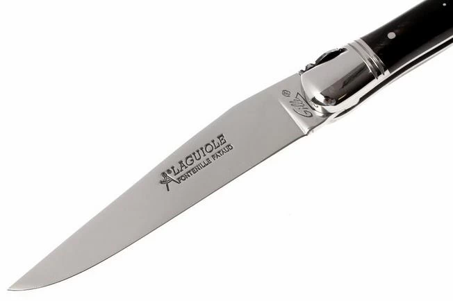 Classic French handcrafted Laguiole pocket knife. Folded length: 12 cm. Exclusive design with blade manufactured from 12c27 steel. Equipped with handy locking mechanism. Handle with casing made of black buffalo horn, decorated with the traditional metal cross design. The handle on each knife is unique.