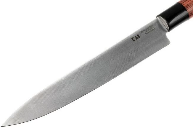 The Kai Shun Seki Magoroku Redwood carving knife 0100P 20 cm is made according to traditional Japanese design. It was designed by and for cooking enthusiasts. Special is its beautifully polished blade and wooden handle. Kai knows better than anyone how to design a knife. The blade of the Seki Magoroku Redwood collection is a true jewel. It has a hardness of 58′ HRC and a very thin grind. This makes the blade razor-sharp and perfect to use. A glossy, polished, rounded spine with a very fine polished edge ensures that the knife is comfortable and easy to use. Cutting meat will therefore be an amazing experience.