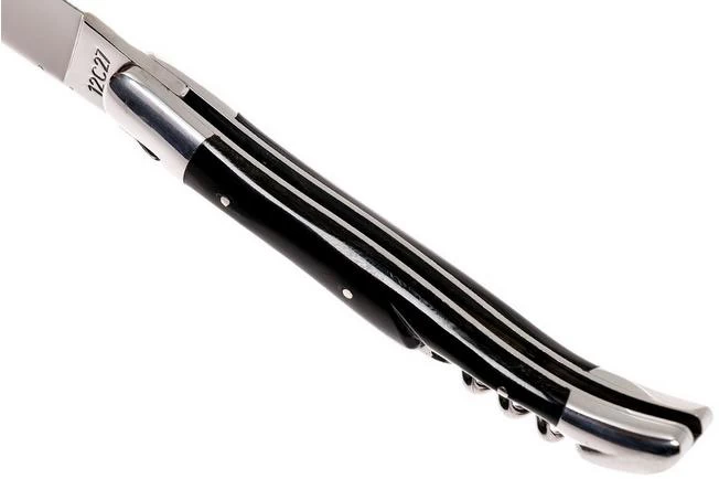 This Laguiole en Aubrac 12 cm pocket knife has a corkscrew. Not only do you benefit from the functionalities of this stunning Laguiole pocket knife, but you’re also able to open a bottle of wine. The spine of the handle is decorated with stunning filework. The blade is made from stainless Sandvik 12C27 steel. Both the bolsters and the blade are polished. This makes the knife look extra chic.