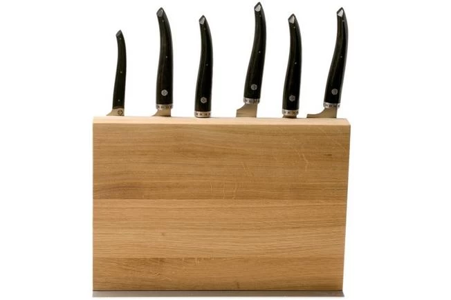 The Laguiole en Aubrac Gourmet knife set is comprised of a magnetic oak wood knife block and six elegant, versatile and handmade kitchen knives. The large ‘belly’ and pointed tip of the knives stand out. Because of this shape the middle of the knife is quite large making it easy to cut a piece of meat or vegetables into pieces. The narrow edge towards the tip is perfect for the more detailed tasks. These knives are made by hand in Espalion, France.