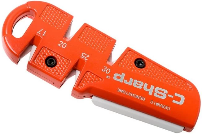 This Lansky C-Sharp ceramic knife sharpener is a practical knife sharpener for on the road. The C-Sharp can, like the Quadsharp, sharpen knives in four different angles: 17, 20, 25 and 30 degrees. The advantage of these fixed angles is that you can easily select the right angle. Even serrated blades can be sharpened with the integrated ceramic sharpening steel! The casing of the Lansky C-Sharp is made from metal and feels decent and solid. Because of the bright orange colour you won’t easily lose this sharpener on the road!