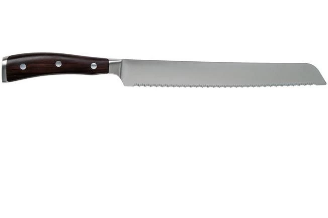 The Wüsthof Ikon double serrated bread knife 23 cm is a bread knife with a luxurious look and feel. Because of the double serrations the knife will quickly and effectively cut through all types of bread. From hard to soft crusts, from soft buns to baguettes. This all-round knife, however, can also cut through delicious pies or a large piece of celeriac.