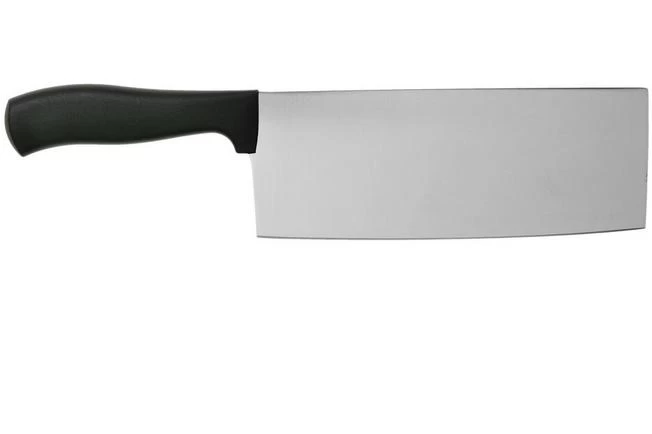 The Wüsthof Silverpoint Chinese chef’s knife 20 cm might look like a Chinese cleaver, it is not! The knife is thinner than a cleaver and only meant to cut herbs and vegetables. Because of the height of the blade you can easily guide the knife with your fingers when cutting vegetables and herbs, and scoop them up.